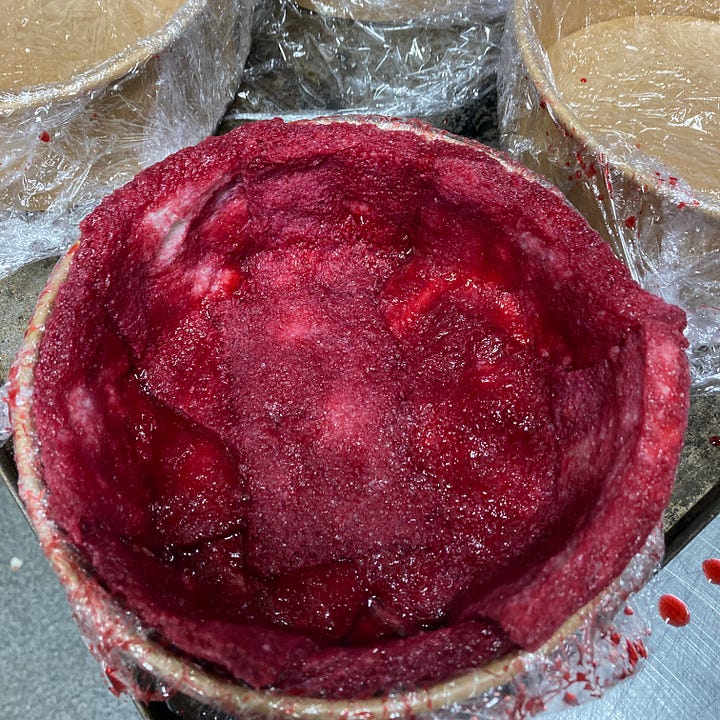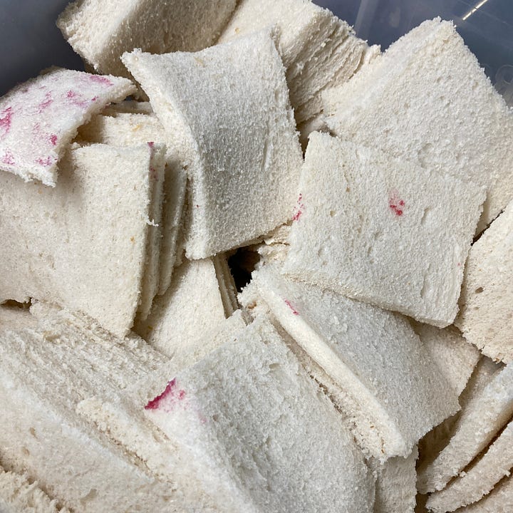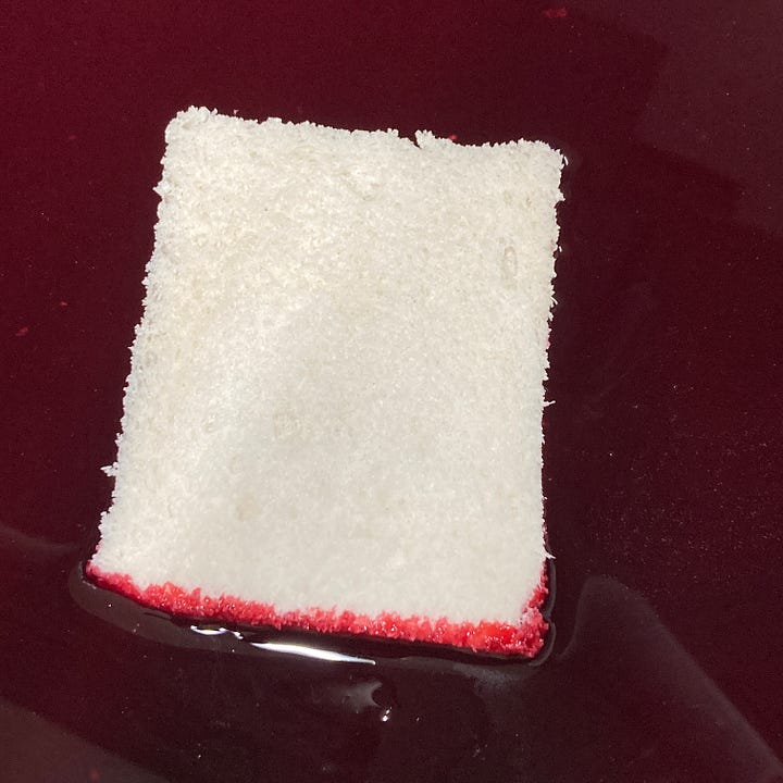 3- Armado: Sumergir rodajas de pan solo de una cara y de a una en el juguito frío e ir forrando el bowl con ellas. Esto es con sensibilidad como con la chocotorta y el tiramisu. Encontrar el tiempo justo de absorción para que esté todo el pan embebido en jugo y sin partes blancas por dentro, sin que se haga una sopa ni se deshaga todo. Es difícil que esto pase, el pan es más fuerte que una vainilla y una chocolina así que sin miedo. Si quedan partes blancas, después en la heladera van a terminar de absorber el juguito de la fruta misma del relleno.